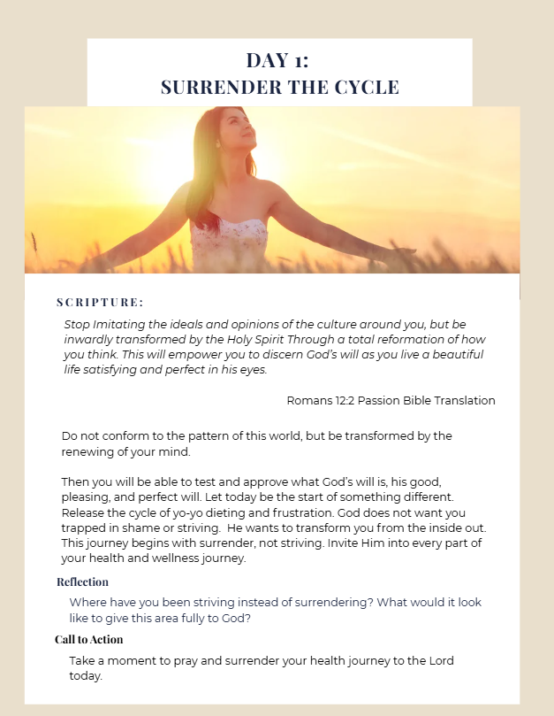 Each day includes a powerful Bible verse, words of encouragement, guided reflection questions, and simple action steps to help you align your health journey with your faith.